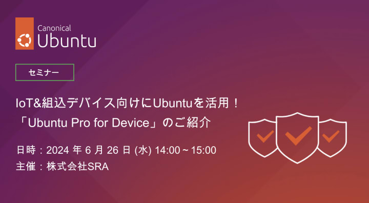 本セミナーでは、Canonical社のIoT Sales Directorである金只 淳嗣氏より、Ubuntu Pro for Deviceの特長やメリット、具体的な採用事例についてお話いただき、併せてUbuntuのLTSバージョン24.04リリース等の最新動向についてもご紹介します。また、SRAが提供する「Ubuntu日本語サポート」と、Ubuntu上でのソフトウェア開発やOS移行、システム構築、セキュリティ対策などをワンストップで支援する「SRA Ubuntuトータルサービス」についてもご紹介します。