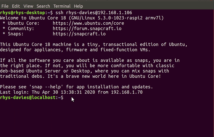 Ubuntuを開始するには、まずRaspberry PiにUbuntu Coreをインストールして設定する必要があります。このためには、新しいタブでチュートリアル(英語)を開き、PiにSSHで接続できるところまで指示に従い、再度ここの戻ってきてください。