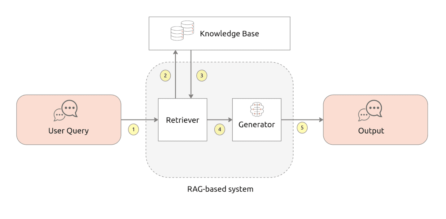 クエリがAIチャットボットで実行されると、RAGベースのシステムはまず、大規模なデータセットまたはナレッジベースから関連性の高い情報を検索し、次にこの情報を指針として応答を生成します。RAGベースのシステムは2つの主要コンポーネントで構成されています。最初のコンポーネントは「リトリーバー」です。リトリーバーは、ユーザーからのクエリに回答するための関連性の高い情報を見つけます。リトリーバーは、データベースを検索して最も関連性の高い情報を選択します。続いて、この情報は2つめのコンポーネントである「ジェネレーター」に提供されます。ジェネレーターは、最終的な出力結果を生成する大規模言語モデルです。