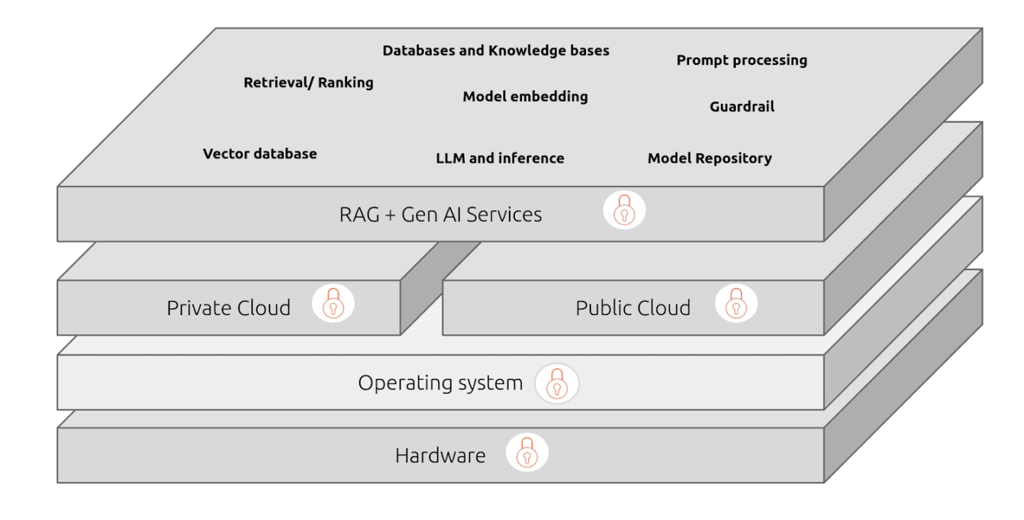 RAGシステムなどの生成AIプロジェクトを構築するには、複数のコンポーネントとサービスが必要です。さらに、どのクラウド環境を導入するか、どのオペレーティングシステムとハードウェアを選択するかの検討も重要です。これらの要素は、システムの拡張性、効率、セキュリティ、コスト効果を確保するために重要です。以下の図は、RAGと生成AIシステムのフルスタックインフラストラクチャの提供を示しています。